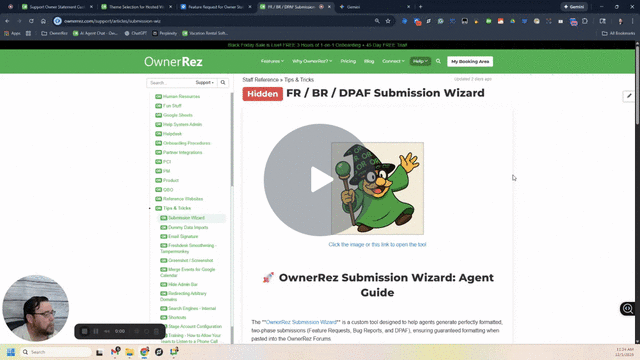 The **OwnerRez Submission Wizard** is a custom tool designed to help agents generate perfectly formatted, two-phase submissions (Feature Requests, Bug Reports, and DPAF), ensuring guaranteed formatting when pasted into the OwnerRez Forums.