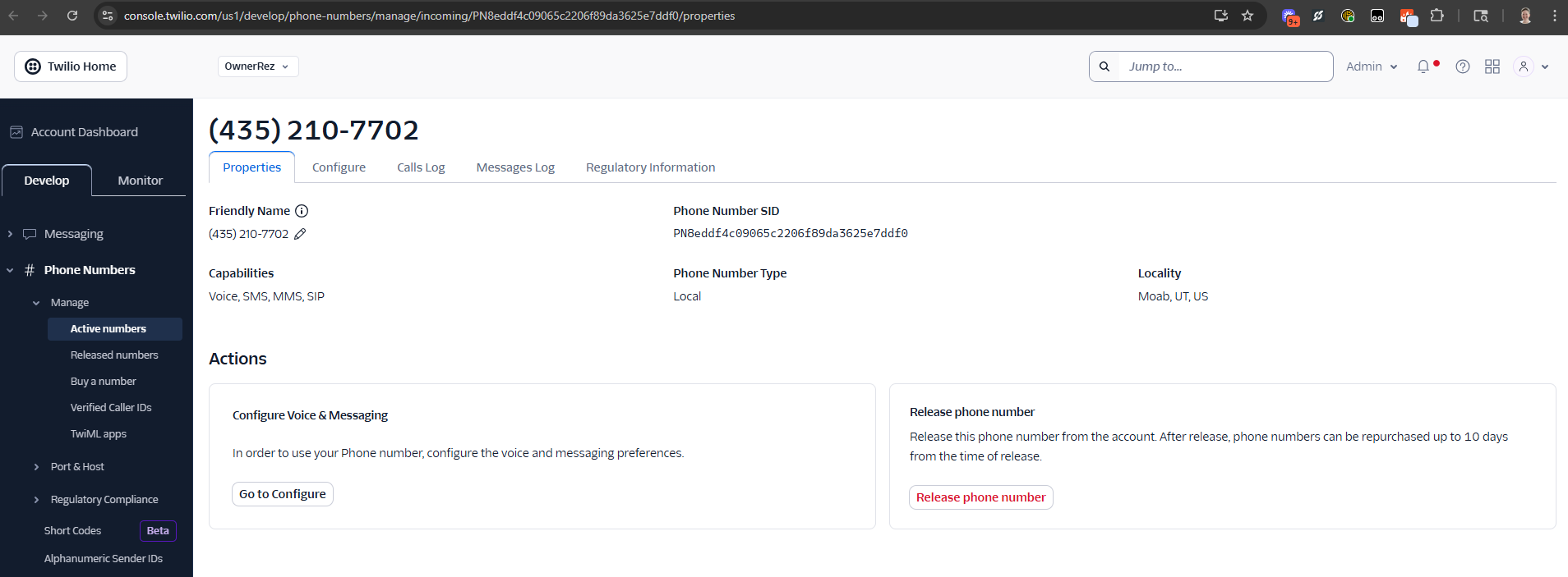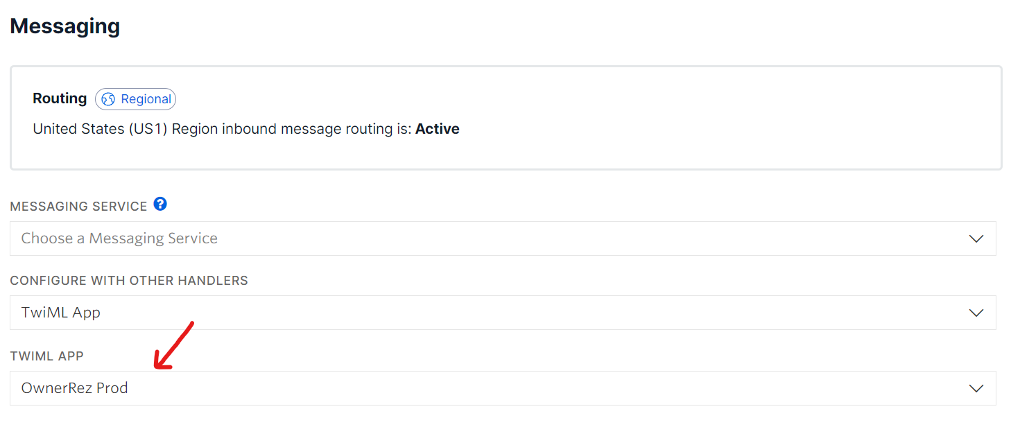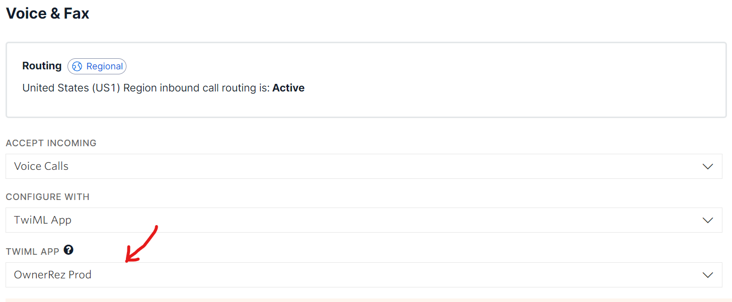 - Update the Phone Number in the Twilio Console and set the message and call TWIML APP to “OwnerRez Prod”