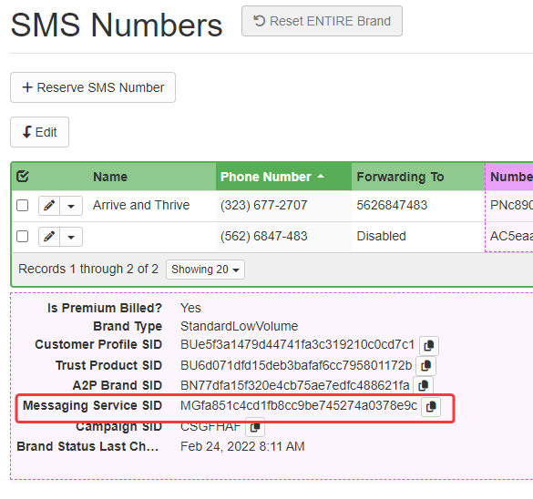 - Go to Messaging Services and search by SID; search for the SID that can be found in OwnerRez for the user of the added number